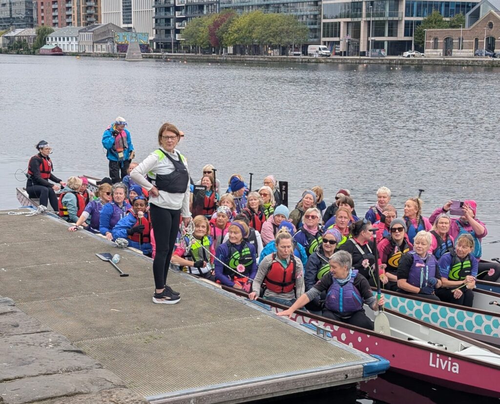 Our annual flower ceremony takes place each year in October, Breast Cancer Awareness month. The ceremony is an opportunity to celebrate survivorship and living after a breast cancer diagnosis and an occasion where we show our support to our members living with cancer. We take time to remember and honour our Plurabelles who have passed away. This year’s ceremony took place on Saturday 11 October and was led by Maria Fleming, who read some beautiful poetry with accompanying music supplied by her sister Eileen on harp and her brother-in-law Frank on fiddle. Pink gerbera were released on to the water in remembrance at the end of the ceremony.